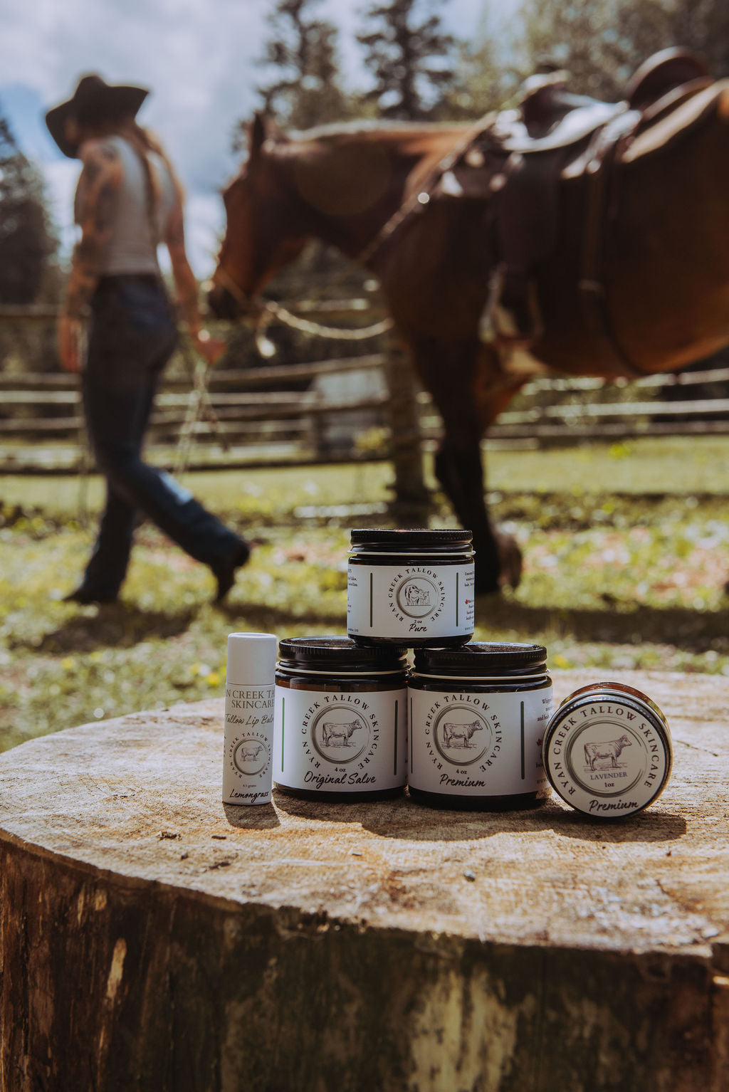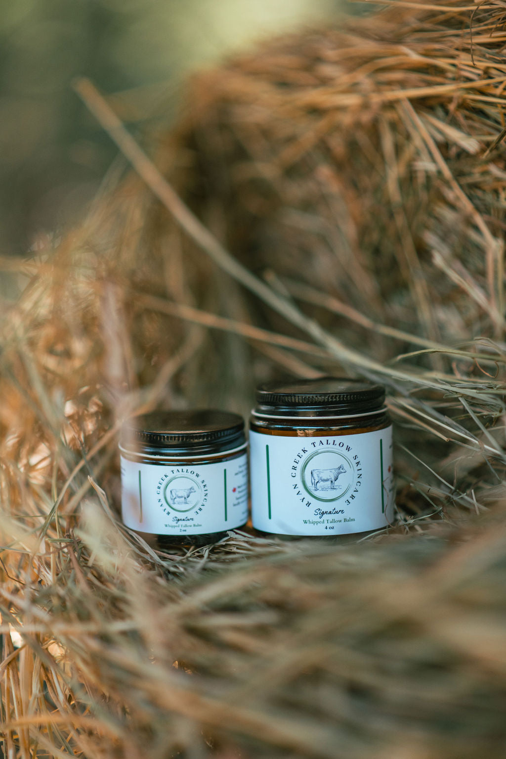 Tallow is a vitamin rich form of rendered beef suet which has been used in skincare for centuries. Tallow contains high concentrations of fat soluble vitamins A, D, K, E, and B1. Grass fed beef has four times as much vitamin E as exclusively grain fed beef. It is known to have anti-inflammatory, anti-microbial, and anti-aging properties. Therefore, making it perfect as a face and body moisturizer. Tallow is healing and great for rashes and minor skin irritations. Ryan Creek tallow is made on our family farm, hand crafted in small batches, and carefully inspected to ensure the highest quality for our customers. We include oils such as Jojoba, and essential oils at 1 % dilution making it soothing for sensitive skin.